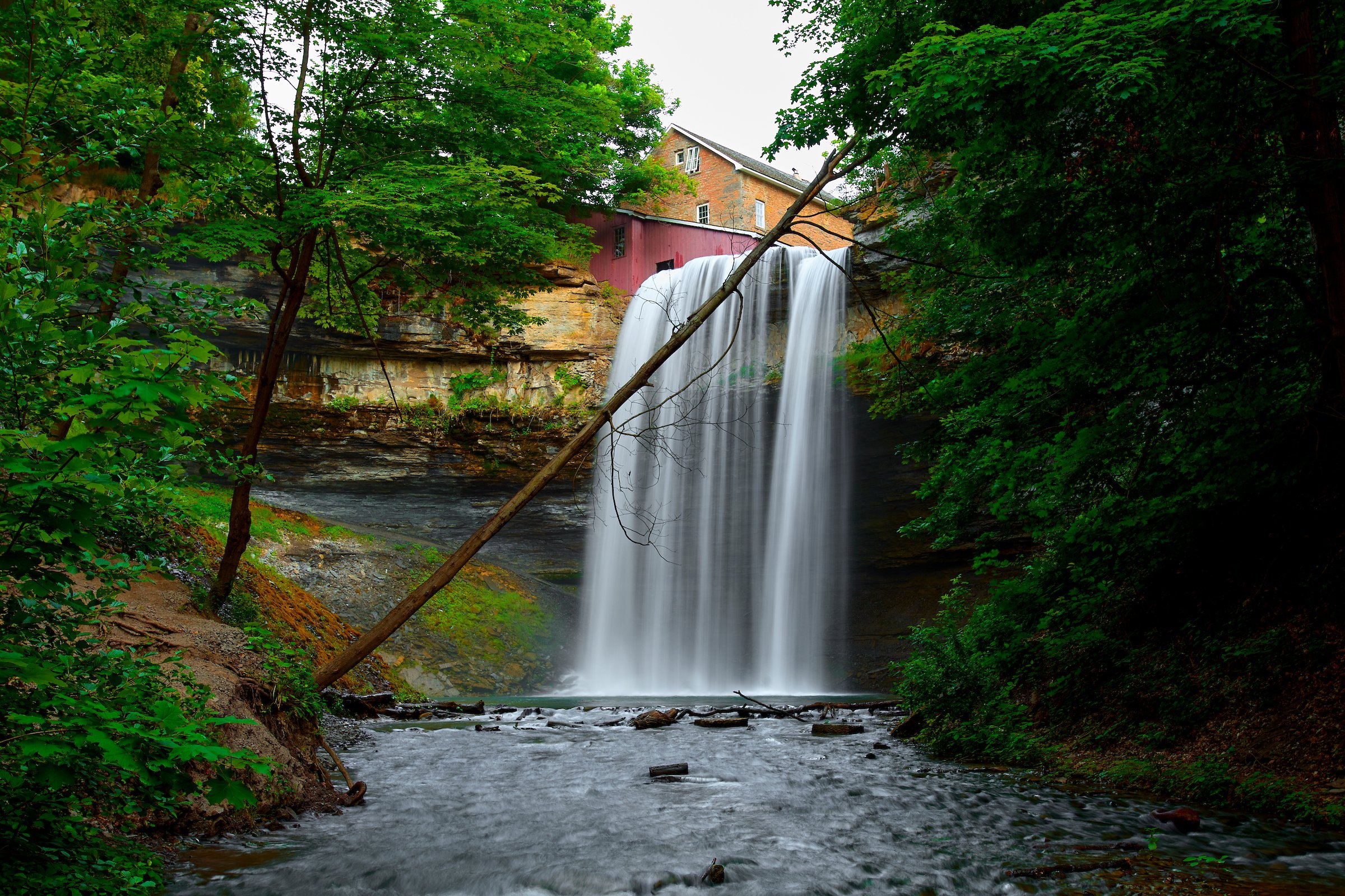 Decew Falls drops over the Niagara Escarpment below Morningstar Mill in St. Catharines, Ontario—where heritage restoration and public access meet the modern demand for wonder.