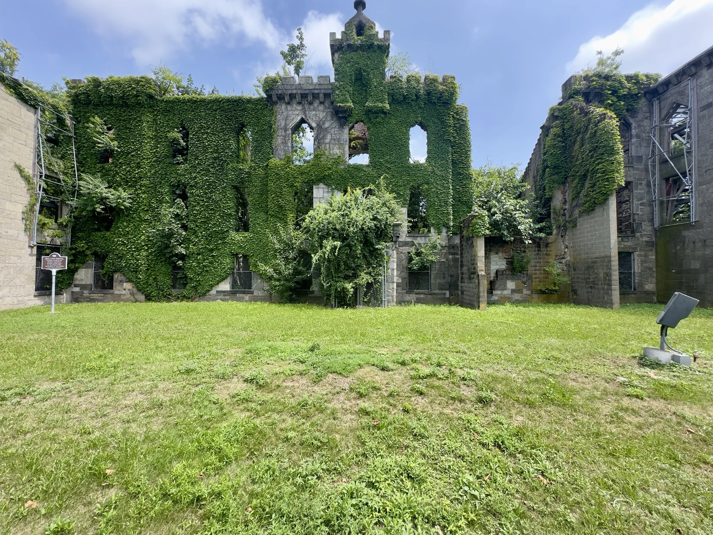 It’s the remains of the former Smallpox Hospital on Roosevelt Island (formerly Blackwell’s Island), a Gothic Revival structure that opened in 1856 as an isolation hospital.