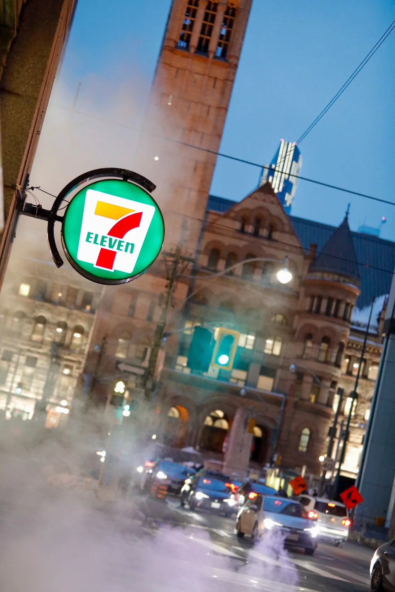 Not a landmark. Not a cathedral. Not a museum. Just a bright, familiar circle of color that reads instantly, without translation, without context, without a guidebook. It hangs there with the confidence of something that doesn’t need to be introduced. Under it, the sidewalk breathes. Steam rises from a vent in the concrete—an exhale from the underground infrastructure that keeps the city warm, moving, running. Behind it, the old stone of City Hall sits in the background like a memory that refuses to be overwritten. Three layers of modern life in one glance: the quick stop, the hidden system, the long history.