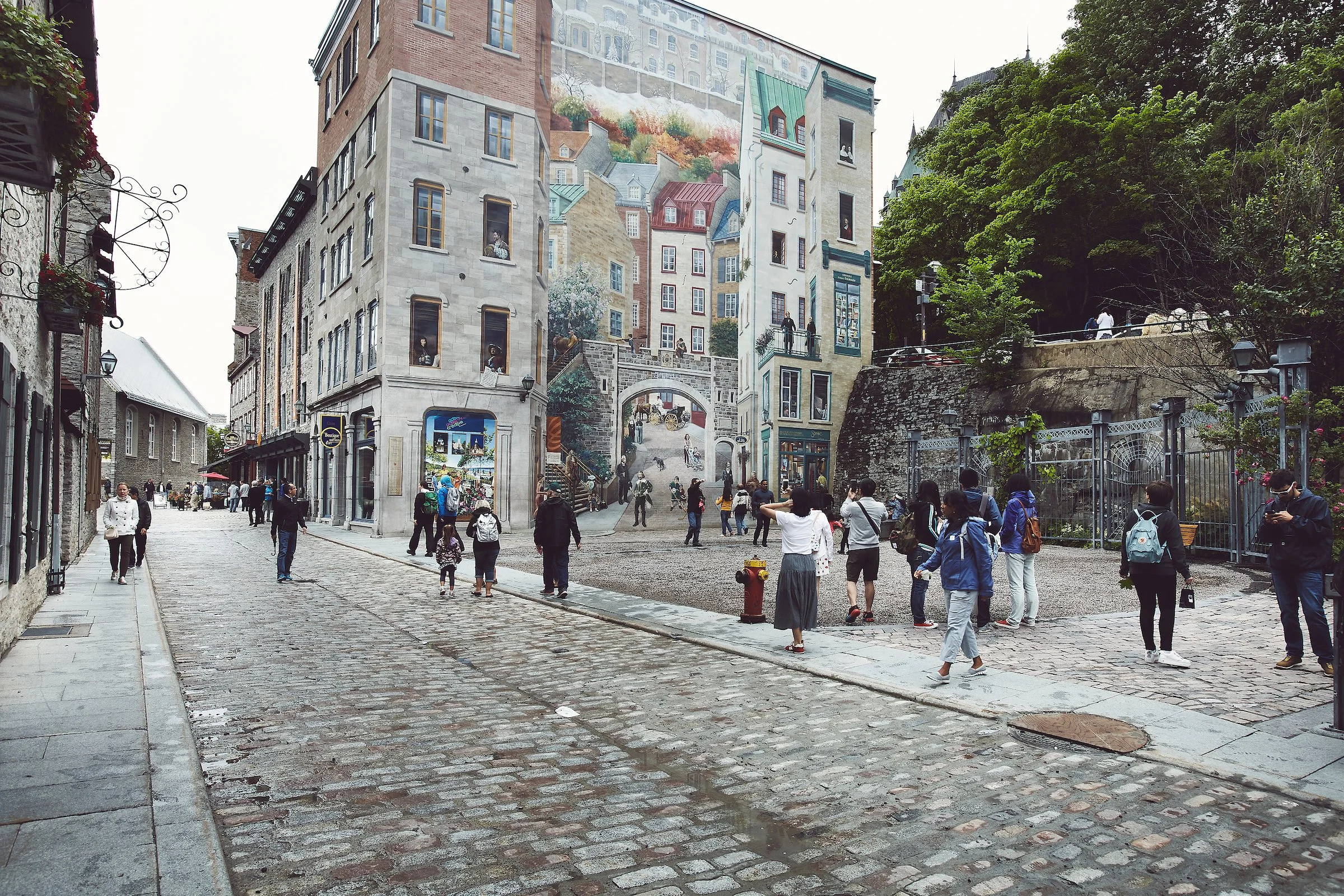 A cobblestone lane in Québec City’s historic quarter opens onto a towering trompe‑l’œil mural that blurs the boundary between present-day street life and the city’s layered past. Visitors move through the scene at walking speed—pausing, pointing, drifting—while stone walls, old façades, and greenery frame the feeling that Old Québec doesn’t simply show history; it lets you step into it.