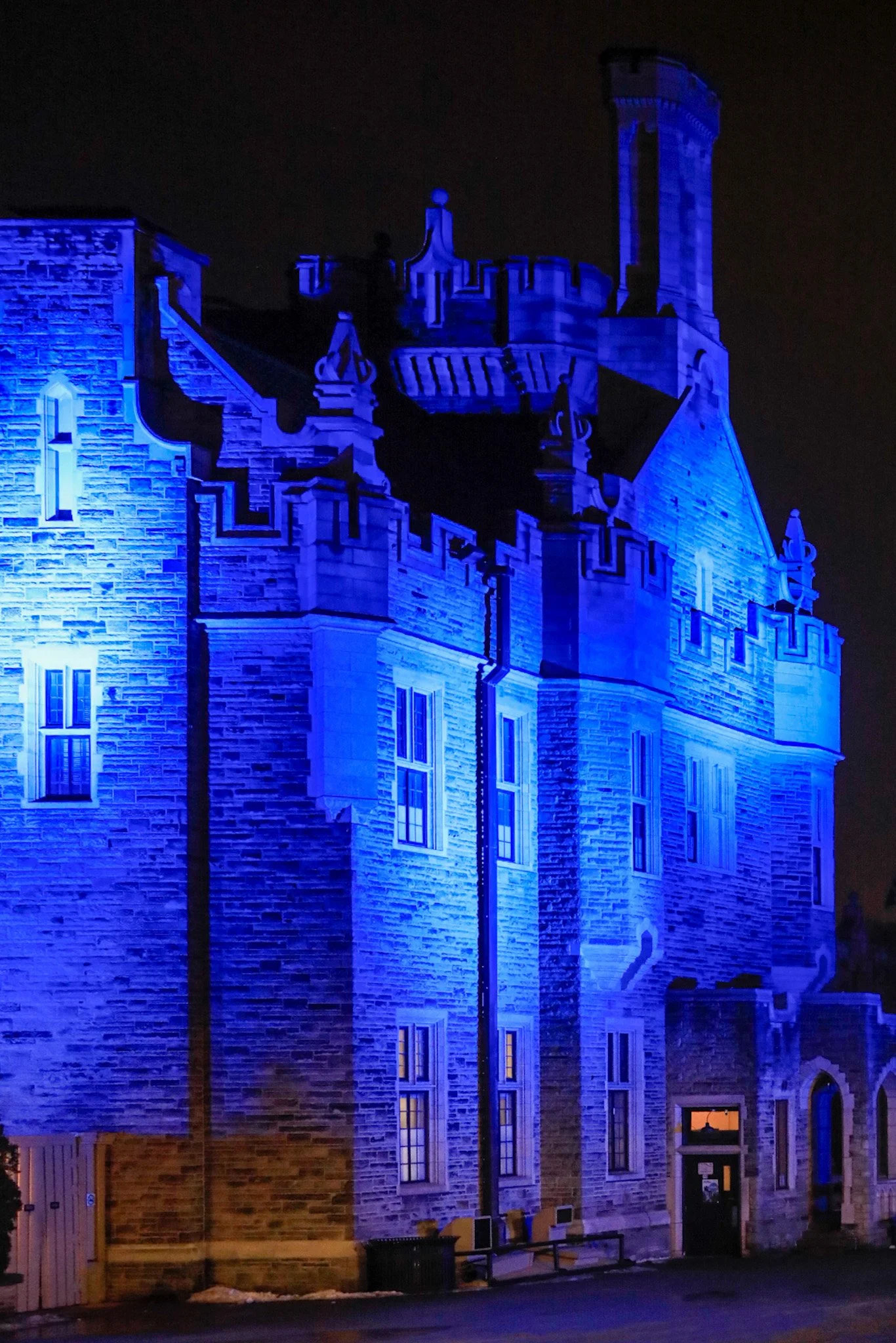 At night, the building’s lighting becomes the narrator. Blue is the most transformative color on stone because it deepens texture rather than flattening it. Where warm floodlights can make old buildings look cozy or museum-like, blue lighting makes Casa Loma look dramatic and slightly unreal. It sharpens edges, deepens shadow pockets, and turns the façade into a sculptural surface. Against a winter sky, the blue doesn’t feel trendy—it feels elemental, like moonlight intensified. The castle’s profile becomes more pronounced, and even familiar architectural details start reading like symbols: battlements as protection, towers as watchfulness, narrow windows as secrecy.