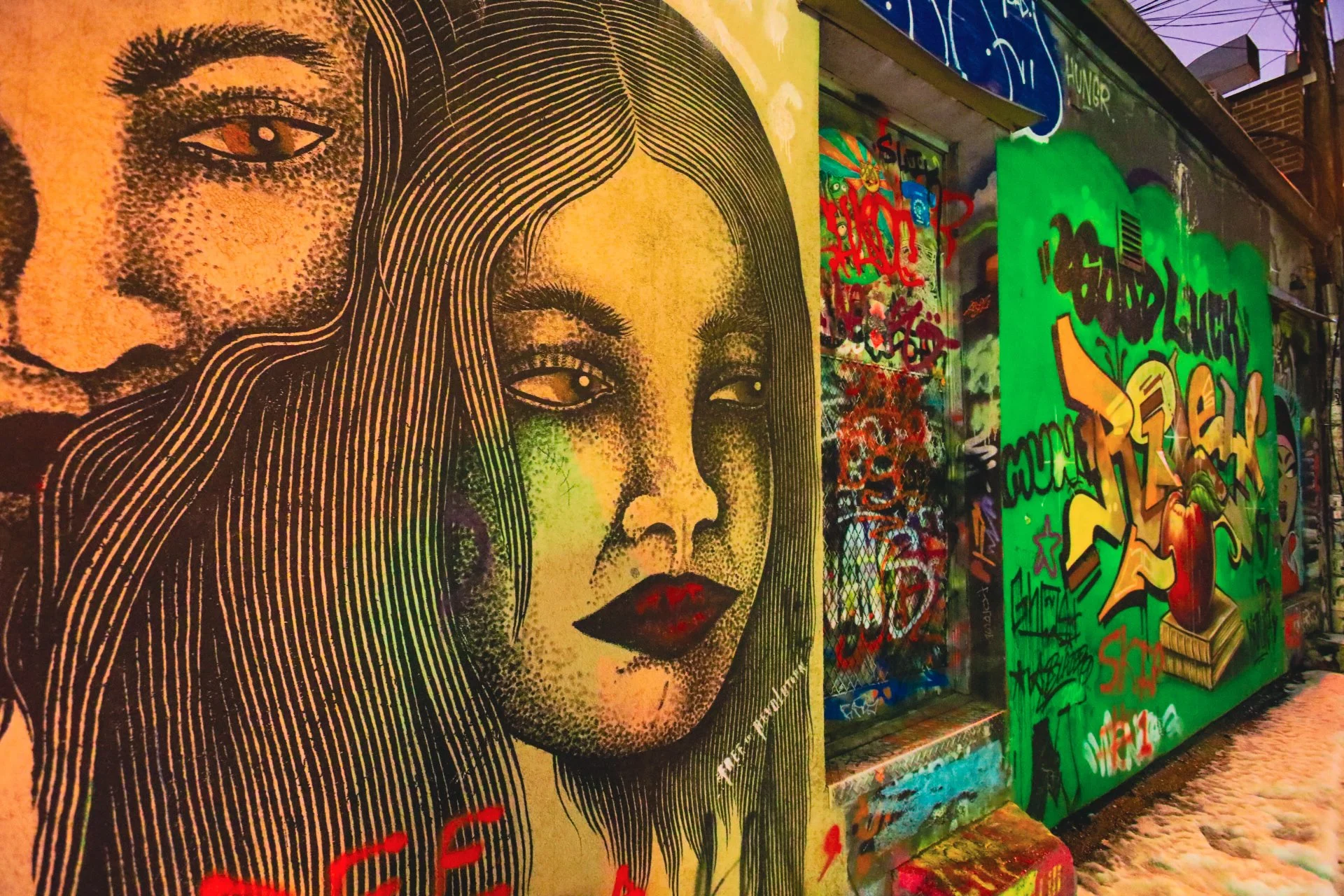 In Graffiti Alley, lettering can be ignored—but faces don’t let you pass so easily. On a winter night, portrait murals turn Toronto’s most famous laneway into a public encounter: eye contact in paint, emotion on brick, and the strange intimacy of being “seen” in a place built for back doors and shortcuts.