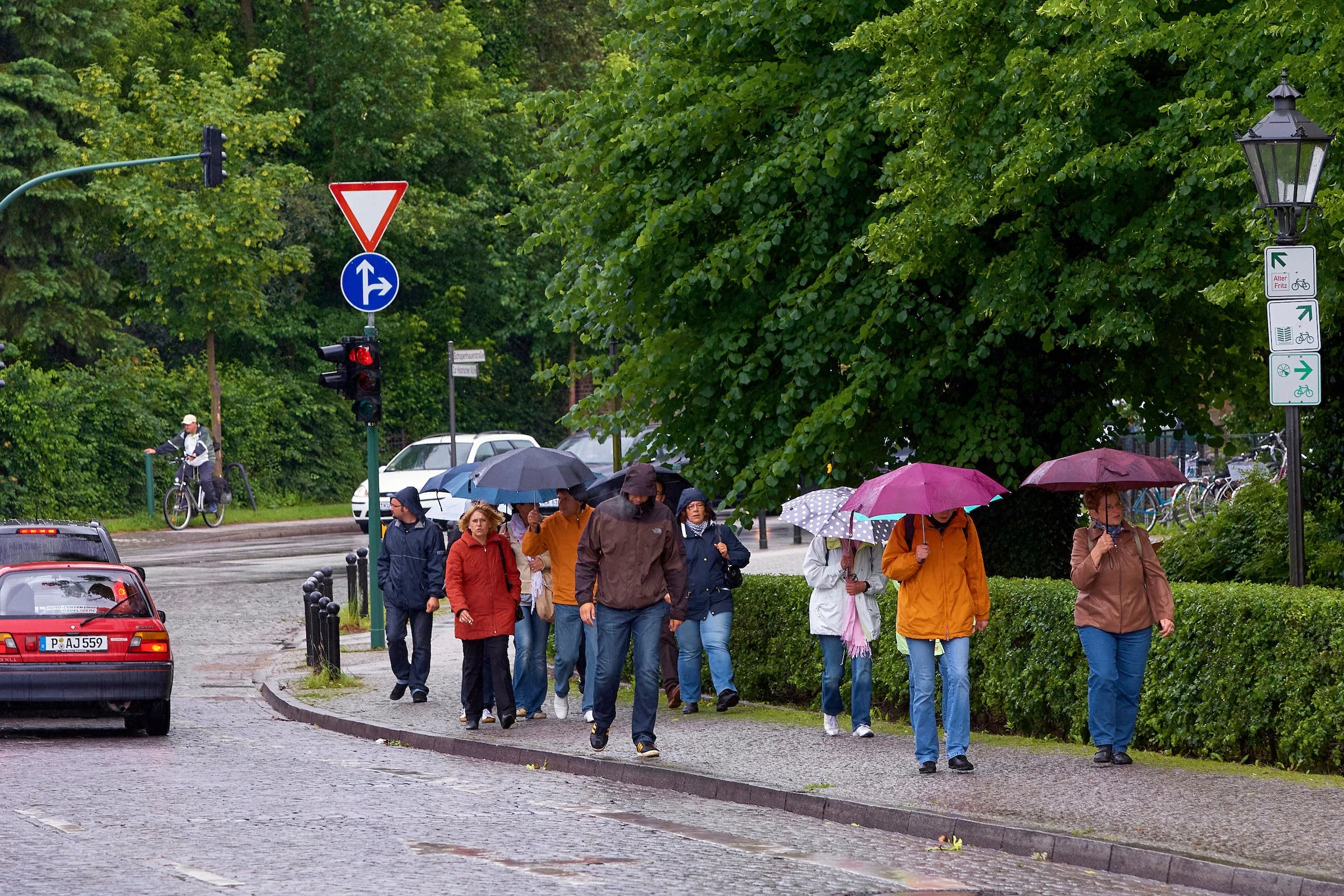 And yet, the photograph also hints at the counter-story: public life hasn’t disappeared; it has become thinner, more fleeting, and easier to miss. Even in a crowd moving forward with heads down, the street still produces moments of involuntary coordination. Someone subtly angles an umbrella to avoid hitting a neighbor. A person at the edge of the group slows for an older walker without making a show of it. A cyclist waits at the light because the signal is red, not because a camera is watching. A pedestrian steps closer to the hedge to allow another to pass—an act so small it would never be called kindness in conversation, yet it is exactly the kind of micro-consideration that keeps cities livable. These gestures rarely result in friendship, and that is not the point. Their function is civic, not intimate. They reaffirm a basic premise: that strangers can share space without hostility, that cooperation can be habitual rather than negotiated, that the public realm still contains a thin thread of mutual recognition even when everyone seems sealed into private worlds. Places like Potsdam—where the built environment still supports walking and cycling routes that link neighborhoods and landmarks—quietly increase the odds that this thread survives because they keep people in the same physical frame long enough for courtesy to occur. A city designed for cars can move people. A city designed for bodies can still, occasionally, connect them.