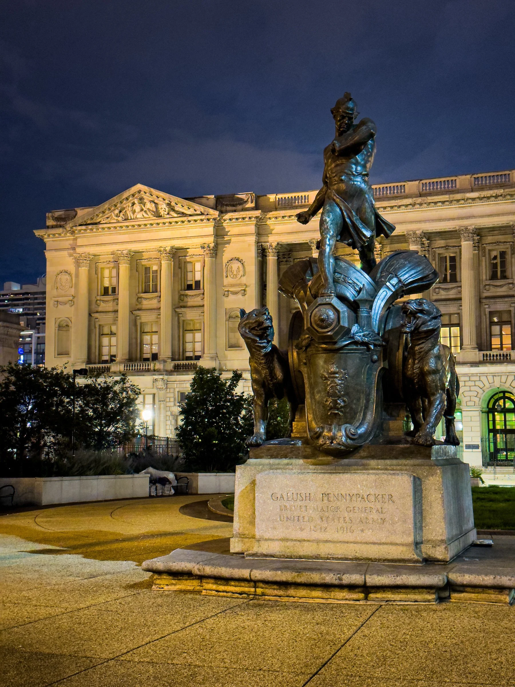 And then there’s the statue—because blue hour needs a protagonist. Near 19th Street and the Parkway, the General Galusha Pennypacker Memorial stands with the kind of dramatic confidence you’d expect from an era when cities believed public art should compete with cathedrals and courthouses. Installed in 1934, it depicts a youthful figure in classical attire stepping forward from an elaborately decorated cannon, flanked by two roaring tigers—a composition that reads less like a polite tribute and more like a scene paused mid‑motion. The work began as an idea developed by sculptor Charles Grafly, and after his death it was completed by his former student and assistant Albert Laessle, who carried the project across the finish line.