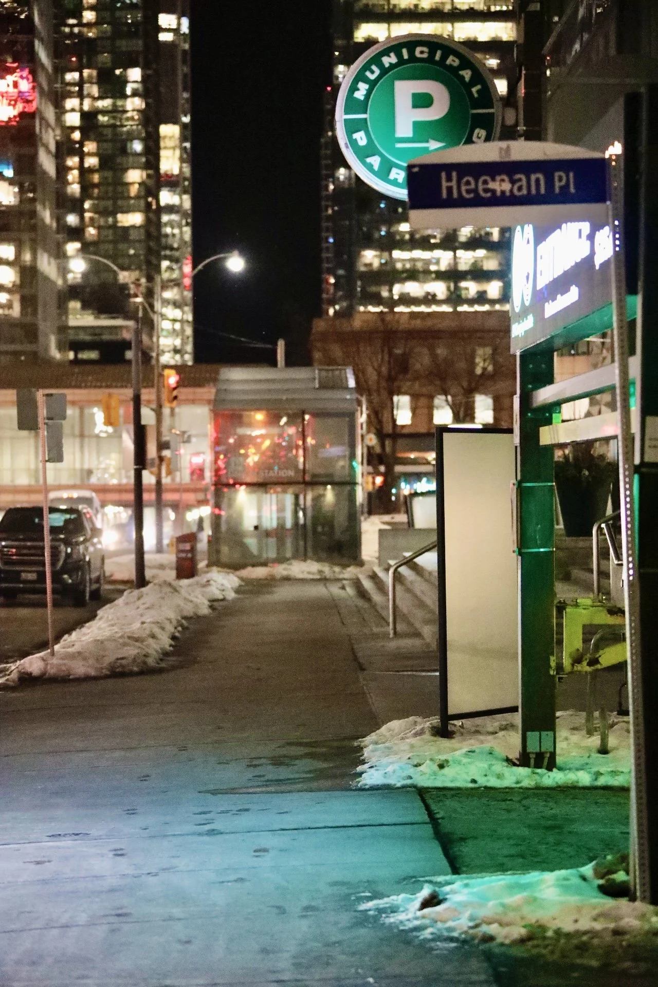 A Green P “Municipal Parking” marker glows above a winter sidewalk in downtown Toronto, where the simplest promise—a place to stop—has become a daily negotiation between time, technology, and the ever-tightening value of curb space.