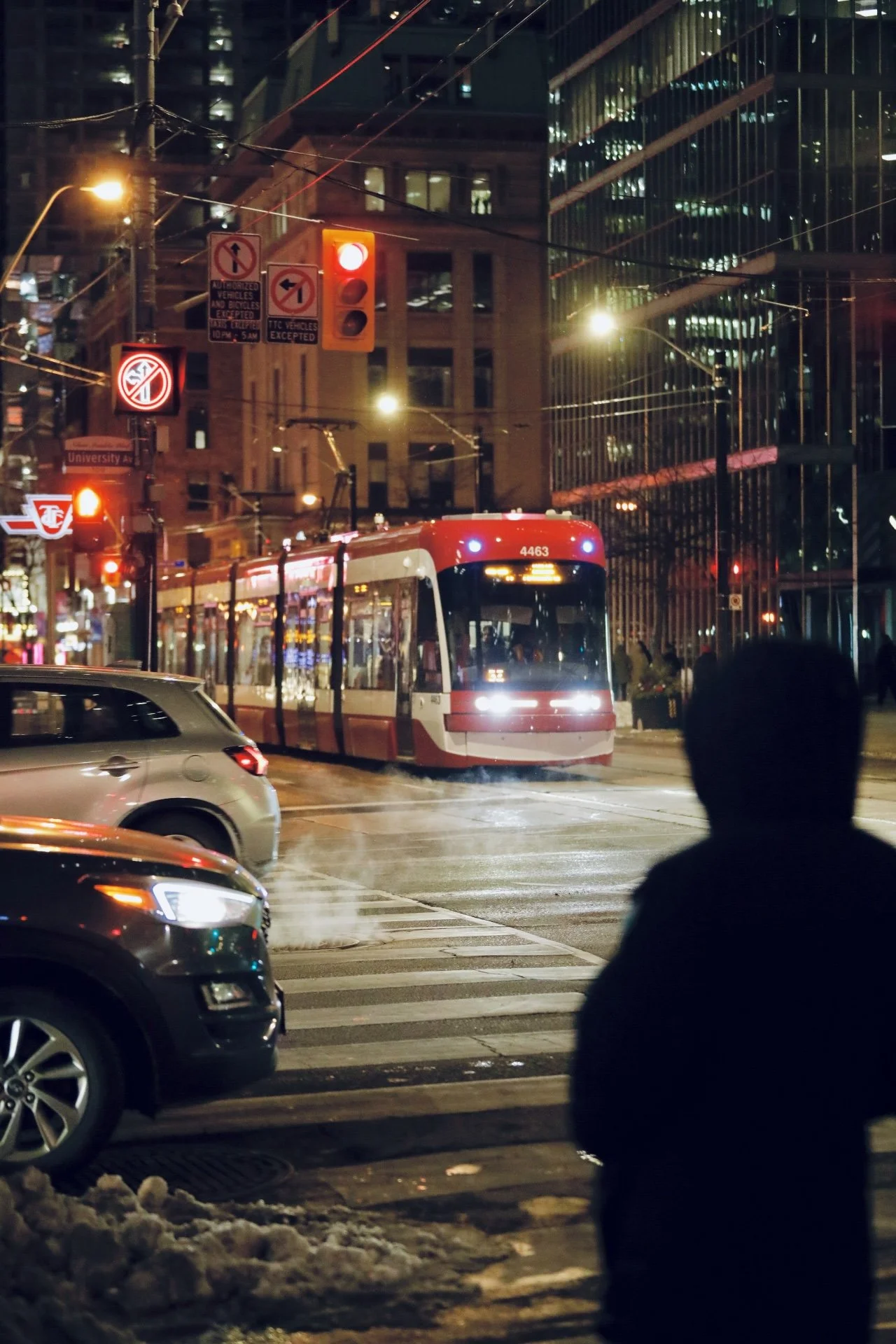 A winter night in Toronto turns transit into a ritual—red lights, overhead wires, steam at street level, and a streetcar carrying the city forward one stop at a time. In a growing downtown, “getting there” has become the story.