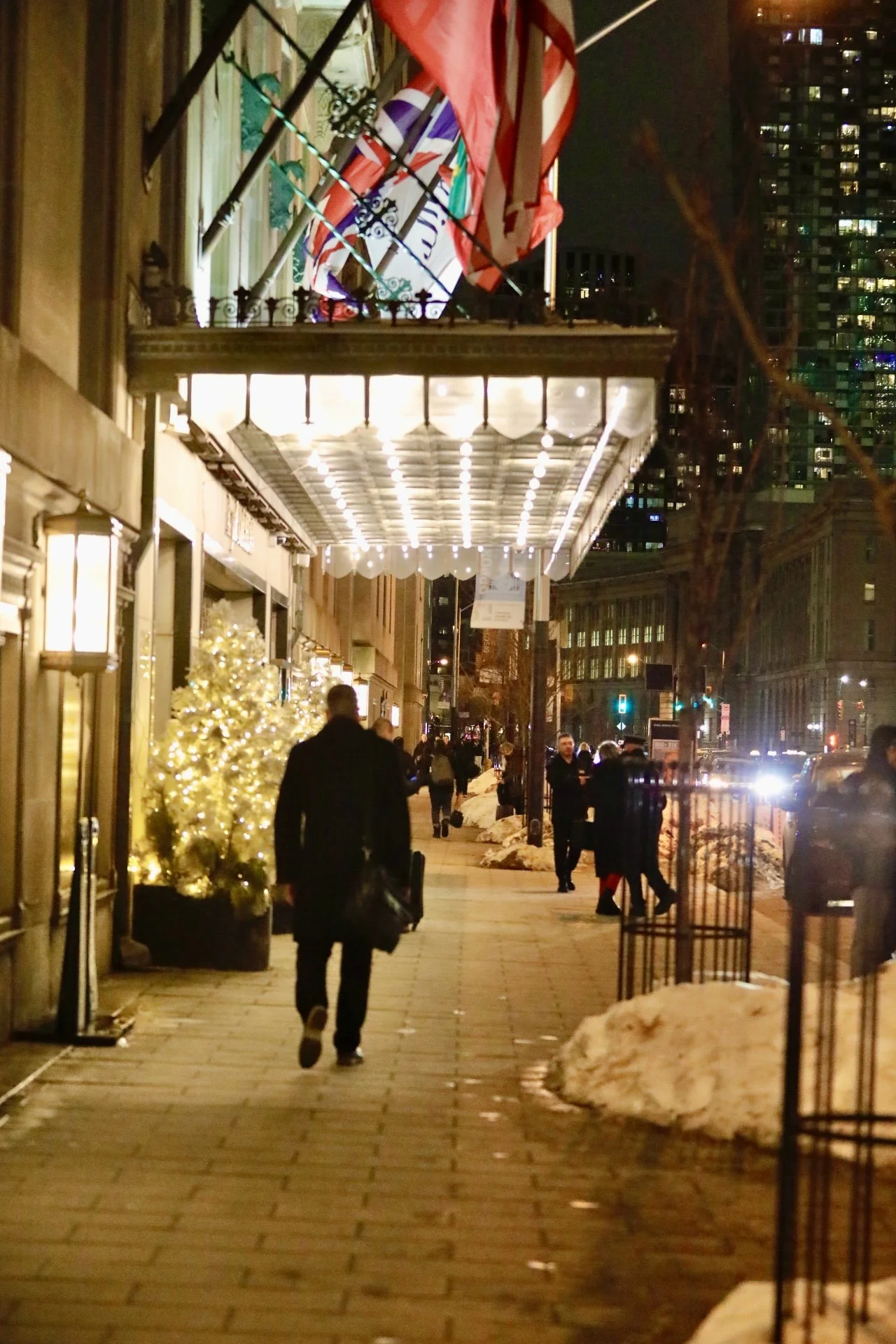 A strong travel editorial doesn’t confuse “luxury” with excess. Luxury, in a city like this, is often control: a dependable entrance, a clear meeting point, a sense that the evening has structure even if the rest of the day didn’t. Under the marquee, the small rituals become visible: arrivals re-centering themselves before stepping inside, couples pausing to decide what the night will be, business travelers moving with that practiced stride that says they’ve done this a hundred times and still appreciate a door that works like a promise. The city beyond is glass and speed; the hotel edge is warmth and order, a place where the cold doesn’t get to dictate the mood.