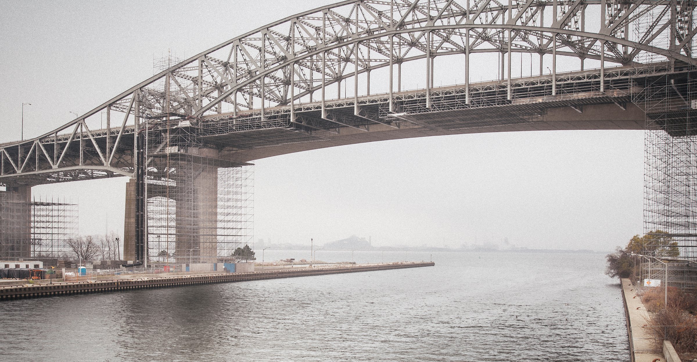 The QEW Skyway cuts a high arc over the water in Hamilton, Ontario, its temporary scaffolding revealing a larger civic truth: the most essential structures—physical and human—often do their work quietly, supporting an entire region without demanding the spotlight.