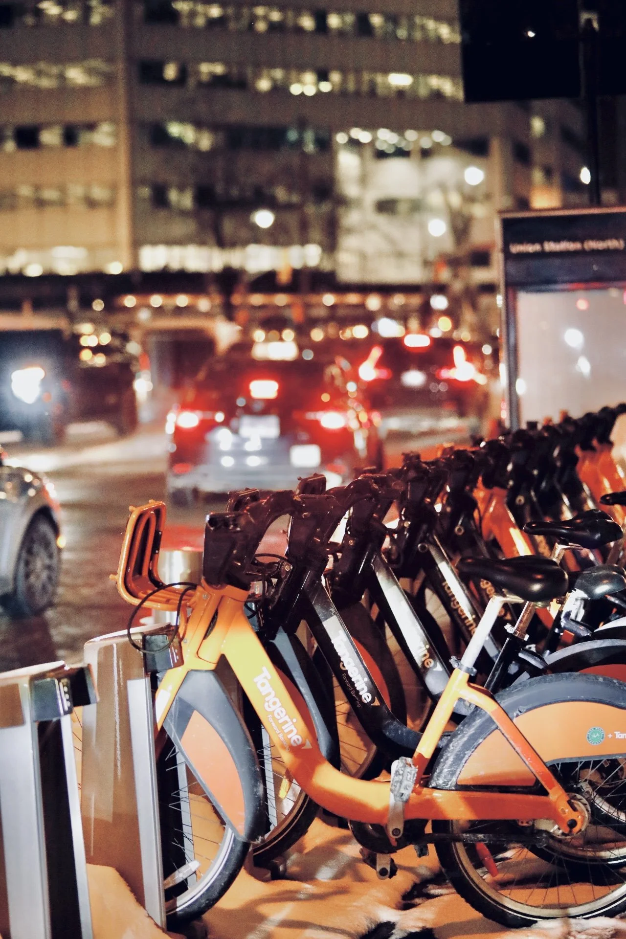 Bike Share Toronto bikes line a downtown station on a winter night—an everyday symbol of a city shifting from storing cars to sharing motion, and the unanswered question of what happens to shared fleets when they age out.